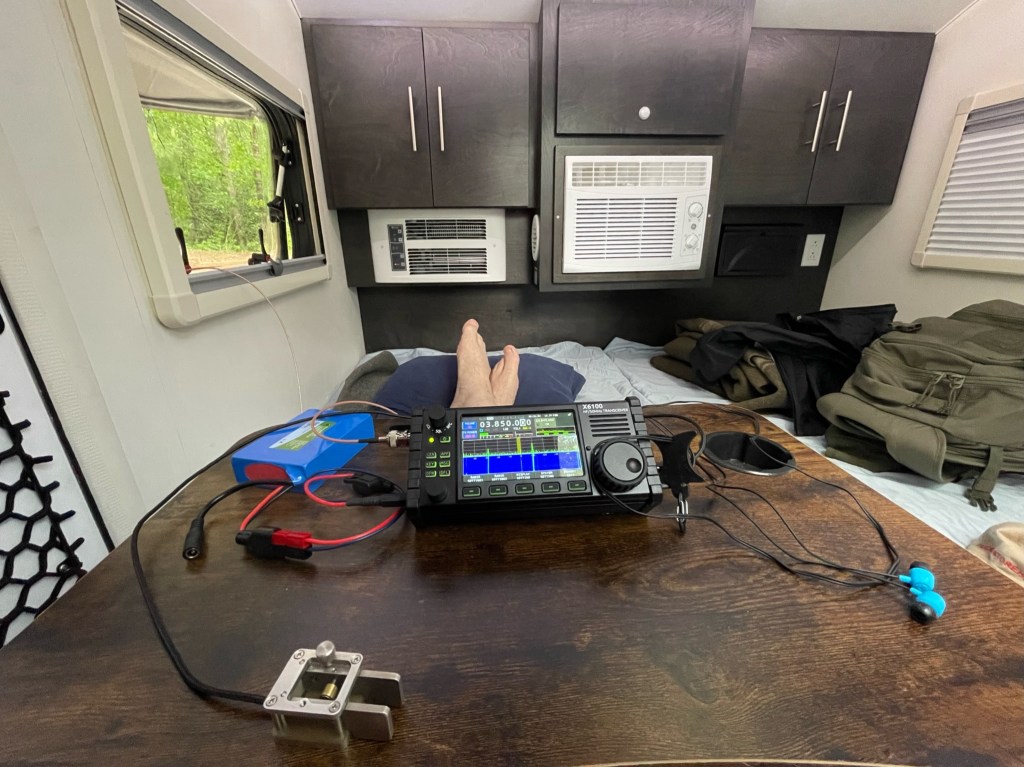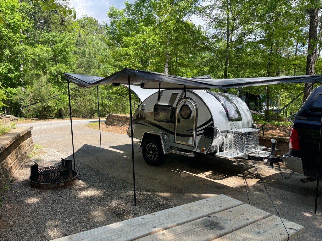 This past Saturday (05-07) was the Georgia POTA Meetup. It was held at Don Carter State Park (K-2171). The park is about a 2 hour drive so I decided to take my new teardrop camper out on its inaugural run. I drove up on Friday. One of the reason for purchasing the camper was to extend my POTA activation range. The camper is made by NuCamp and so far I am pretty impressed with it. It pulls well behind my pickup truck and I only lose about 1/2 mile a gallon for gas. Set up was easy. Since I didn’t disconnect the trailer from the truck, I was set up and good to go in about 15 minutes. Here is a shot of the camper set up.