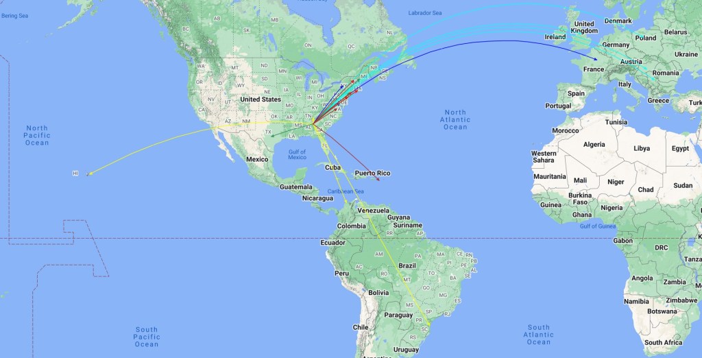 The hard part is picking out the call sign. I normally run at 16-20 wpm. First I tune around to find one of the slower guys (30 wpm). I then decode his call sign, one figure at a time until I get the whole thing. My decoder is between my ears. This can take time but it helps to acclimate to the new speed. I like to say that I dabble or putter about and try to make a few contacts. I’m not going to win any awards for most Q’s, but I am going to get better at receiving code. I started my sending at 20 wpm, but that sounded like I was standing still. So I upped it to 22 and then again to 25 wpm. My first goal was to work one station on each band. I then changed it to making 1,000 points. I made over 20 contacts in the course of several hours. It was slow and it was difficult. It showed me that I can copy code at 30+ wpm, not well, but well enough. Here is a map.
