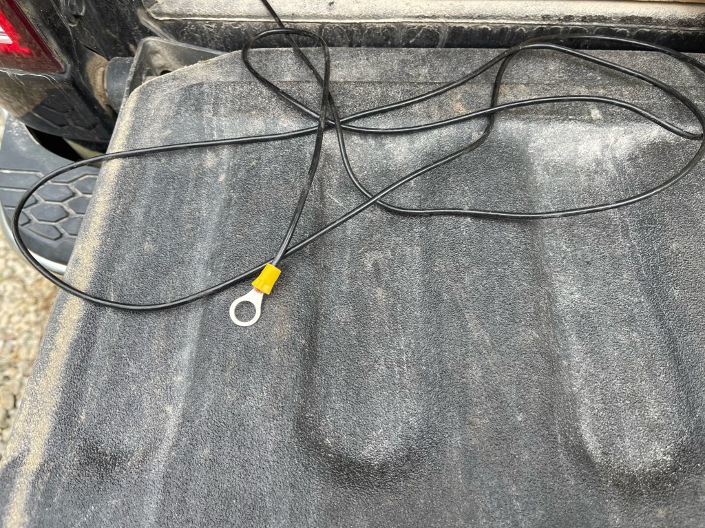 The ground wire was made from some surplus Flexweave I had. I took a grinder and ground a bare spot near the back of the truck bed, secure the wire with a sheet metal screw, and then painted it flat black.