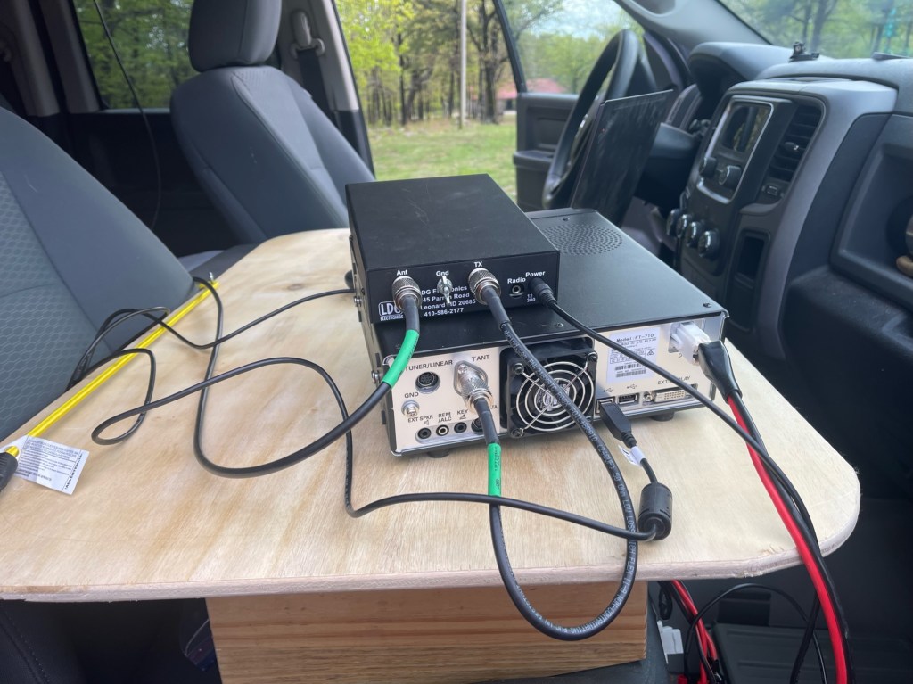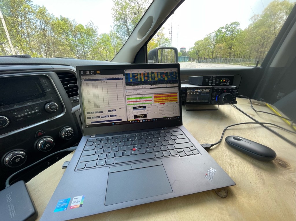 Normally for a day activation, I bring one of my smaller low-power radios such as my IC-705. However, I recently added the FT-710 to the stable and I wanted to get it outdoors. Along with the radio, I built a new antenna configuration using my Frankentenna and a desk for the truck. Info about the antenna can be found here https://kk4z.com/2023/04/07/frankentenna-stealth-mode/ and the desk info can be found here https://kk4z.com/2023/04/07/necessity-is-the-mother-of-invention/ The setup looks like this: