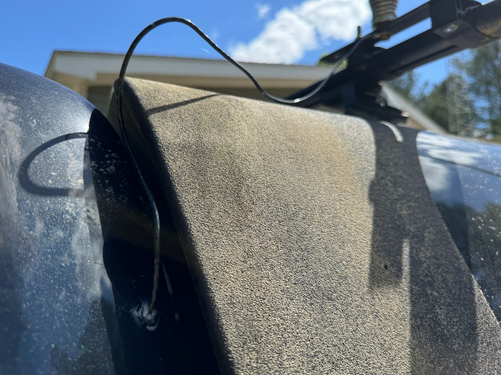 For a tuner, I used Icoms new AH-730. It replaces the AH-4 and is a much nicer unit. The AH-730 and the AH-4 are actually couplers much like the SGC SG-237. They are designed to connect directly to the wire antenna. Coax is only used between the radio and the tuner. I ran a 12 ga stranded wire from the tuner to the antenna which is mounted on my camper roof rack. It is a standard 102″ stainless steel whip. I only had to drill a small hole through the cab sheet metal, add a grommet and a little RTV and I’m done. I drilled an additional 3/8″ hole in the plate where the whip antenna attaches to the truck so I can easily add a horizontal wire for low band NVIS. All I need to do is attach the wire to the truck, stretch it out to a tree, hit the tune button and operate.