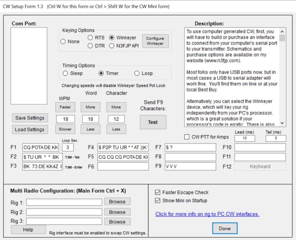 The CW machine is hooked up to your radio via one cable that plugs into your key jack. For it to work correctly, you must set your radio keyer to straight key. To use it with your computer, you need a serial to usb port adapter. Power can come from either the computer or a separate power source. Whatever, you are running your radio with (12v) will work just fine. The CW machine only draws about 20 mAh so it’s perfect for field operations. It could also run off of a 9 volt battery.