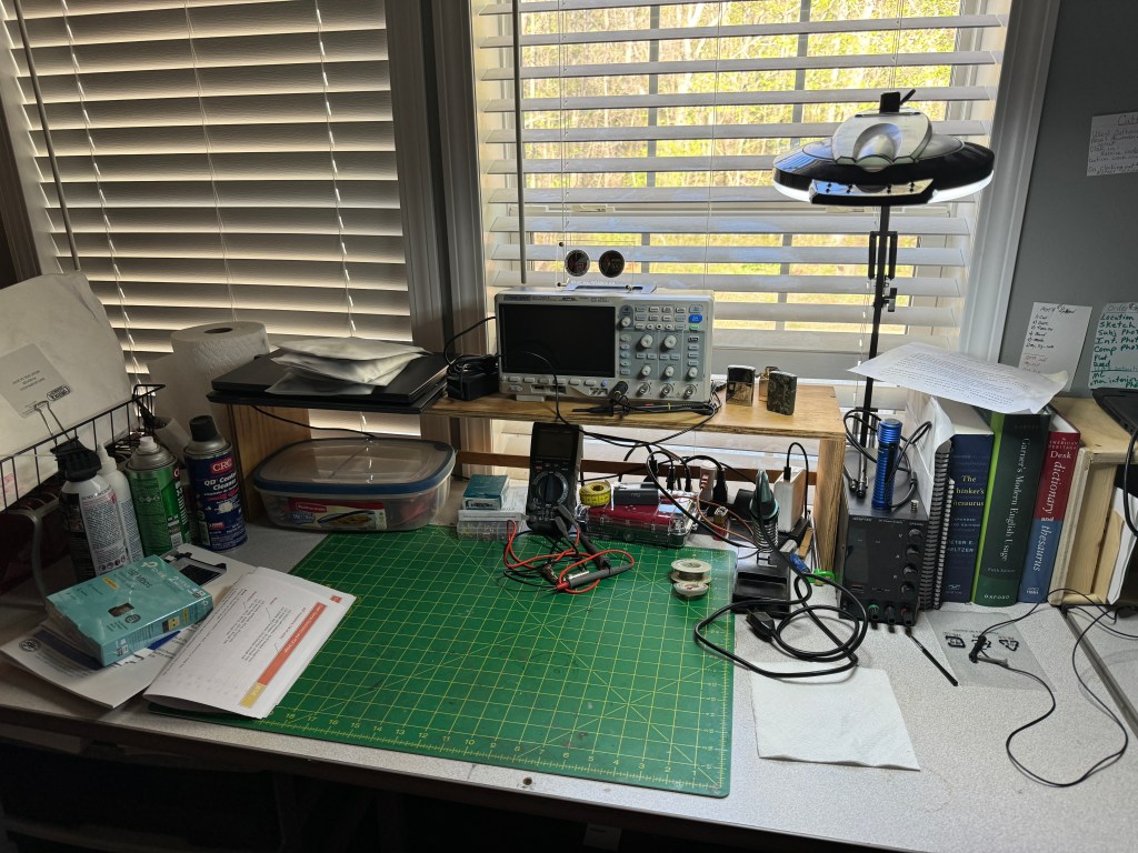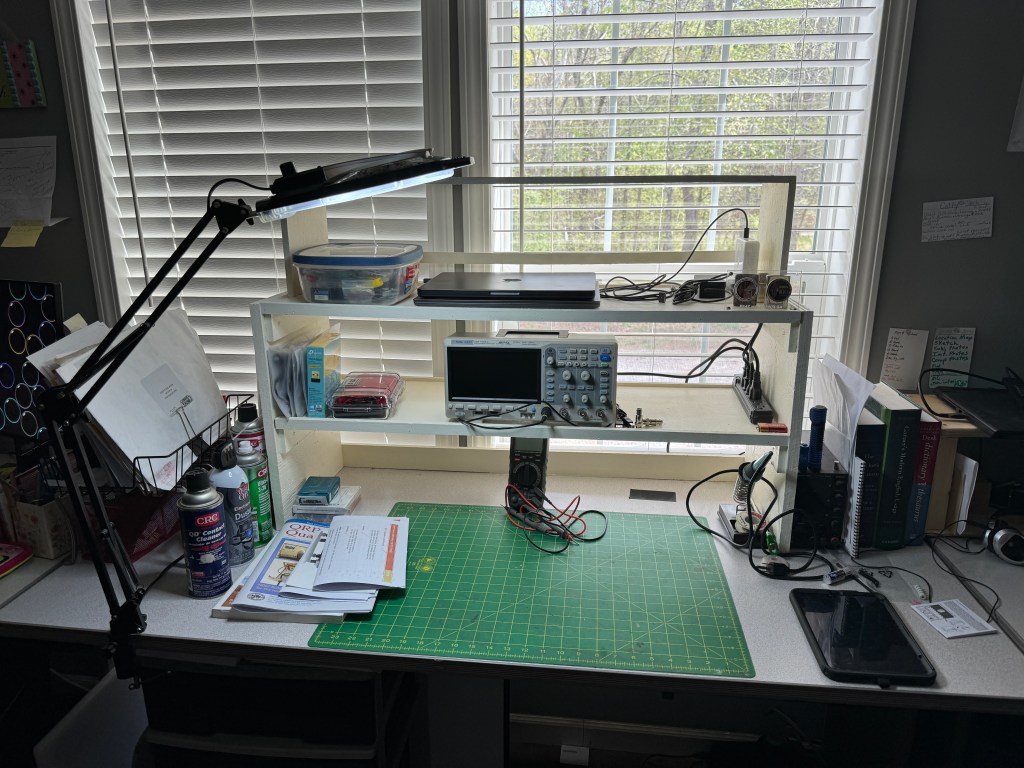 Because the shelves are open in the back, they still let a lot of light in. I haven’t gotten my parts from DigiKey yet so the building/experimenting part is on hold. However, I am pressing forward with the written/video portions of my class.